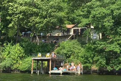 Plage privée et quai pour bateaux. Profitez de la baignade dans une eau fraîche et propre. Sautez du quai ou pataugez depuis le rivage. Apportez votre bateau et amarrez-vous au quai ou louez des kayak ... lire la suite
