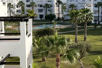 Appartemment 2 chambres avec jolie terrasse orientée sud-ouest, proche de la Mar Menor (15-20 min en voiture), dans le golf des saurines. Résidence sécurisée 24/24h(Las Terrazas de La Torre), porte bl ... lire la suite