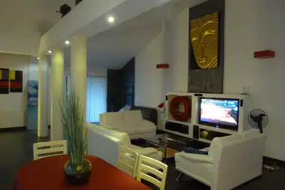 Maison d'architecte familiale. Entrée indépendante. Le logement 100% indépendant, consiste à un loft de 75 m² lumineux, calme, loin de la rue, vous serez réveillés par le chant des oiseaux. Terrasse a ... lire la suite