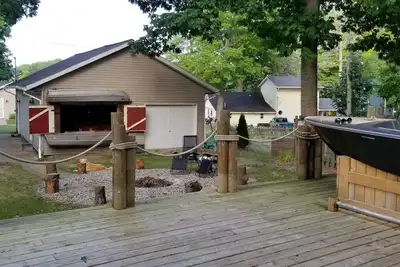 Lake-house avec bain à remous et bar avec zone de divertissement combinée avec foyer et pont près de Cannonsburg / Belding / Kent County. Deux histoires. Trois chambres. Deux bains complets. Terrain ... lire la suite