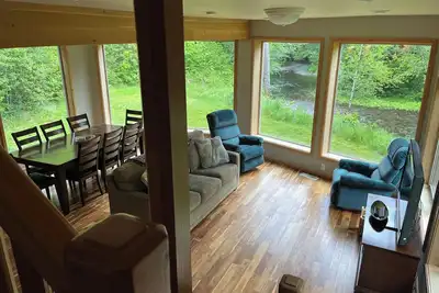 Maison de bord de la rivière tout à fait unique sur 40 acres de propriété. 8 personnes, 2 chambres-1 King matelas en latex organique, 1 Reine Sleep Number, lit gigogne avec matelas en mousse à mémoir ... lire la suite
