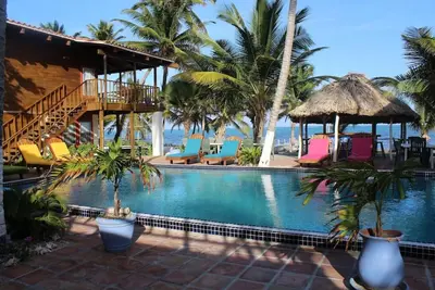 Villa Rising Sun est un 6,200 pieds carrés. Villa sur la plage à Hopkins Belize. Votre location est tout le premier étage avec entrées privées, 3 chambres, deux salles de bains, votre propre bar de p ... lire la suite