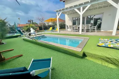 Villa de 141 m2 avec jardin de 543 m2: - Piscine 11 x 6 profondeur de 1 à 1.40 m. - Accès internet wifi illimité. - Séjour/Salle à manger 50m2 - Cuisine 11m2 entièrement équipée ( Lave vaisselle, micr ... lire la suite