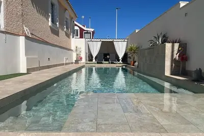 Charmante maison avec 3 chambres, 2 salles de bain, cuisine équipée, TV, Wi-Fi, Climatisation, machine à laver, piscine, solarium (rooftop), BBQ, ... Nouvelle piscine (2024) 3x8m avec escalier et banq ... lire la suite