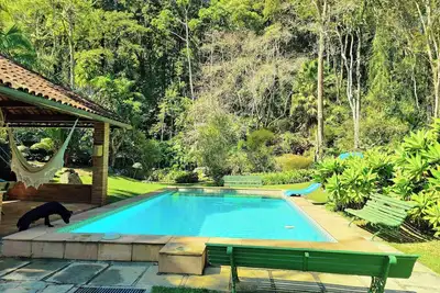 Située dans un endroit calme, tranquille et entourée d'une nature luxuriante. Située à Teresópolis-RJ, la maison récemment rénovée a à la fois un air rustique et le confort d'un lieu avec cheminée, belle mezzanine, barbecue et piscine pour passer du temps en famille et entre amis. Un endroit pour se reposer, méditer, se promener, découvrir, rêver... qui n'oubliera pas !