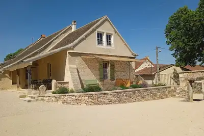 Vignerons retraités en agriculture biologique, œnophiles passionnés, Sylvie & Pascal vous ouvrent les portes d'une élégante demeure vigneronne de caractère du XVIIIe chargée d'histoire, soigneusement restaurée avec goût dans les règles de l'art , lovée au calme en belvédère sur un plateau sud-est exposé dominant la douce campagne vallonnée du haut mâconnais. Calme total au creux d'un bucolique écrin préservé de nature & verdure en lisière immédiate de prairie, à l'orée d'une vaste forêt (faune sauvage observable sur site). Au cœur d'un paisible mini hameau rural typique, le plus ancien répertorié d'Ozenay (pittoresque village préservé, riche d'une église romane classée du XIIe & d'un majestueux château médiéval du XVe). Magnifique environnement, 100% relaxant & reposant. Belle vue dégagée sur la campagne alentours. Superbes panorama & paysages. Gîte de grand confort. Très spacieux. Vaste pièce de vie. Chaleureux cachet campagnard d'esprit contemporain, mixant traditions & modernité, sublimé par une restauration patrimoniale soignée (conservation des linteaux en pierres & bois, poutres, charpentes, mur en pierre… tous d'origine). Énormément de charme & caractère. Très cosy. Ambiance douillette et dépaysante d'une demeure pétrie d'histoire & d'authenticité. Large terrasse abritée sans vis-à-vis ouverte sur la prairie (vaste terrain naturel privatif). Grande cour modulable en littéral terrain de pétanque. Composition : Maison de village mitoyenne voisinant habitation propriétaires (totale indépendance). Wifi (fibre). Chauffage électrique. 1er étage (ou rdc par l'arrière de la maison) : séjour-cuisine-salon, 2 chambres dont 1 « familiale » en duplex (2 lits 1 p. 90x190cm / lit 2 p. 160x200cm + 3 lits 1 p. 80x200cm), 2 salles d'eau (douches), 2 Wc indépendants. 2ème ét. : salon TV (bouquet Canal Sat dont Canal plus) avec espace couchage (2 lits 1 p. 90x200cm électriques). Terrasse couverte + terrain naturel + local vélos + parking privés. Toutes commodités à 7 km. Grand confort et totale sérénité au sein d'un magnifique cadre paysagé ! Élégante maison vigneronne de caractère du XVIIIeme siècle, pétrie d'histoire & restaurée dans les règles de l'art, lovée sur une vaste propriété naturelle au creux d'un reposant écrin préservé de nature & verdure, à 6.5 km de la cité médiévale de Brancion & 7 km de Tournus (toutes commodités et A6 sur place). Calme & tranquillité en pleine campagne viticole vallonnée, succession de verdoyants bocage, coteaux de vignobles & collines boisées, blotti au cœur d'un pittoresque mini hameau rural résidentiel du massif sud Bourgogne, à deux pas des bucoliques vignobles du haut mâconnais & d'un vaste espace préservé classé en « Zone Natura 2000 ». Emplacement ultra privilégié, sur les tracés du circuit des églises romanes, d'un itinéraire cyclo de 42 kms agréé « boucle vélo coup de cœur », de la route des vins du Mâconnais-Beaujolais, de sentiers pédestres balisés en « balades vertes » & d'un circuit VTT référencé directement connecté au réputé GTM (Grand Tour du Massif Sud Bourgogne / très riche réseau de chemins de randonnée & parcours VTT de mêmes types à découvrir dans les environs proches), à 6 km du GR 76 et 7 km de la voie verte longeant la Saône. Localisation de choix en plein cœur du Tournugeois-Clunisois (labellisé « Pays d'Art et d'Histoire »), non loin des vignobles des Côtes Chalonnaises & du Beaujolais, à la croisée du Mâconnais, du Chalonnais, de la Bresse Bourguignonne & de la Bresse de l'Ain, tous riches de sublimes paysages, de gastronomies renommées et d'un patrimoine historique littéralement exceptionnel. Idéal pour facilement rayonner : à 11 km de Lugny (première cave productrice des vins de Bourgogne), 22 km du bourg médiéval de Saint-Gengoux-le-National (labellisé « Cités de Caractère de Bourgogne-Franche-Comté »), 20 km du Pont de Vaux (port de plaisance fluvial lié à la Saône), 28 km de l'illustre cité abbaye de Cluny, 32 km de Mâcon (Gare TGV Mâcon Loché à 34 km / Gare du Creusot TGV à 48 km), 34 km de Chalon-sur-Saône (labellisée « Ville d'Art et d'Histoire »), 35 km du somptueux joyau paysager de la Roche de Solutré labellisé « Grand Site de France » & 36 km de Louhans. La villégiature de charme idoine pour un ultra confortable "countrybreak" en mini tribu ! Prenez une « pause à Outry »...