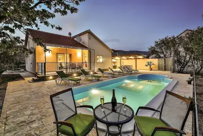 Cette belle maison de vacances avec piscine se trouve dans le Kastel Stafilic. La maison comprend trois chambres à coucher, trois salles de bain ainsi qu'une cuisine avec salon. Un barbecue est également à votre disposition, sur lequel vous pourrez préparer différentes spécialités. Les plus jeunes membres de la famille apprécieront certainement le contenu disponible pour les enfants. Kastel Stafilic est connu pour son château Rotondo, construit en 1508. Visitez également la ville historique de Trogir.