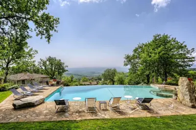 Maison 10 pièces 314 m2 sur 2 niveaux. Aménagement confortable et plaisant: séjour ouvert avec cheminée et TV (satellite). 2 chambres doubles, chaque chambre avec: air-conditionné. Séjour avec cheminée et TV (satellite). 1 chambre double avec air-conditionné. 1 petite chambre avec 1 lit et air-conditionné. Galerie mansardée, ouverte avec 1 lit et air-conditionné. Séjour avec TV (satellite). 1 chambre double avec air-conditionné. Cuisine ouverte (4 plaques de cuisson, four, lave-vaisselle, congélateur). 4 douches/bidet/WC. À l'étage supérieur: séjour/chambre à coucher ouvert avec 1 lit double, cheminée et TV (satellite). 2 chambres doubles, chaque chambre avec: air-conditionné. Cuisine ouverte (4 plaques de cuisson, four, lave-vaisselle, congélateur). 2 douches/bidet/WC. Chauffage au gaz, air-conditionné (en sus). Meubles de terrasse, barbecue. Très belle vue sur les alentours. A disposition: lave-linge, chaise haute pour enfant, lit bébé. Internet (Connexion WIFI, gratuit). Maximum 1 animal/ chien autorisé. IT052005B4YP63KC2M