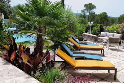 Villa tout confort proche de la mer ( 8 pers.) dans l'arrière-pays varois entre Brignoles et Hyères / Toulon. Décoration soignée. Environnement très calme (lotissement privé sans circulation), vue dé ... lire la suite