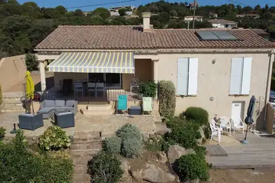 villa d'architecte 180 m2 achevée le 15 juin 2015 vue mer de toutes les chambres, terrain de 3600 m2 ombragé par des chênes et des oliviers. Accès à la maison par un chemin de terre d'environ 15 mètr ... lire la suite
