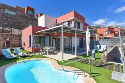 Villa moderne, confortable "Joviano". Dans le haut de la station de Maspalomas, au centre d'El Salobre. A usage privé: terrain (clôturé), piscine rectangulaire (7 x 3 m, profondeur 130 - 130 cm, dispo ... lire la suite
